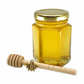 - 6 oz (net weight) honey in glass hexagon jar with gold lid