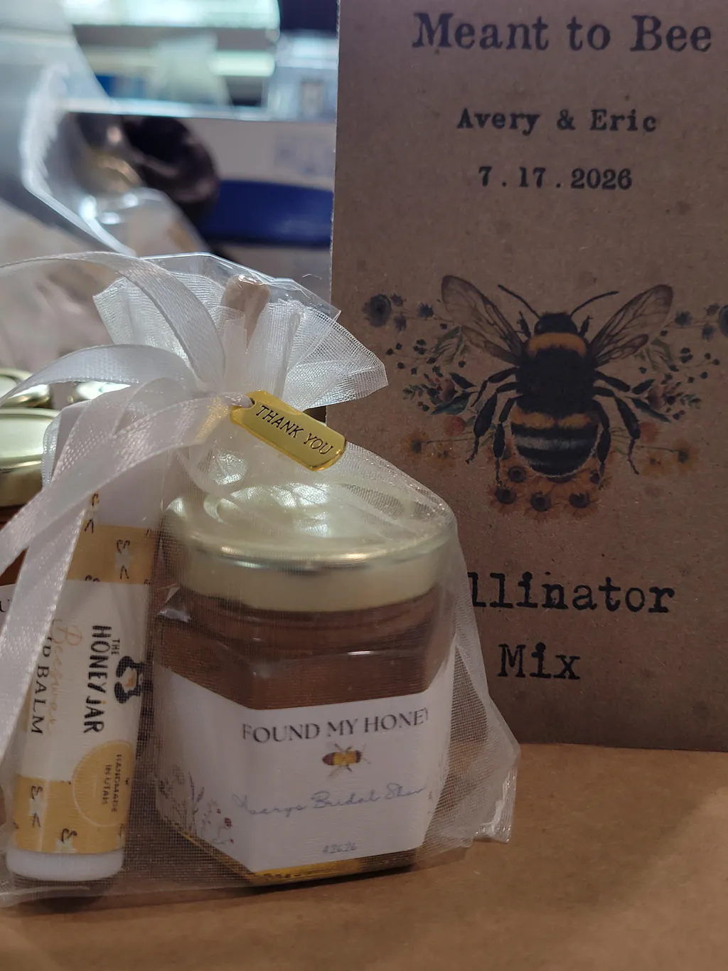 All favors are filled with pure American Clover Honey from beekeepers in the Intermountain West: Montana, South Dakota, North Dakota, Wyoming, Idaho, and Utah.